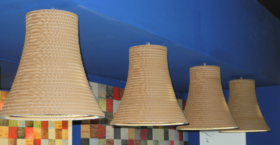 Elementi di arredo per uno stand fieristico (Cersaie 2013 - Bologna) in cartone interamente Avana da 13 mm. Il lavoro ha richiesto la progettazione e lavorazione di scaffalature, poltrone e lampadari.